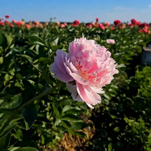 Цветы — главный элемент привлекательности этого сорта. Период цветения начинается в мае и продолжается 2–3 недели. Бутоны крупные, от 16 до 20 см в диаметре, густомахровые, с многорядным размещением лепестков. Окрас нежно-розовый с перламутровым отливом, в центре оттенок обычно более насыщенный, что усиливает глубину цвета. Лепестки широкие, волнистые, создают воздушную, почти шелковую структуру цветка. Форма напоминает раскрывающийся бутон пионов традиционных китайских сортов. Аромат тонкий и приятный, с лёгкой сладкостью, комфортный даже для тех, кто не любит ярко выраженные запахи.