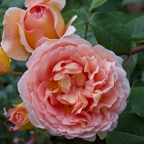 Цветки саженца отличаются нежно розово-абрикосовой окраской с желтым основанием лепестков, что создаёт неповторимую игру оттенков. Диаметр цветка составляет от 9 до 11 см, а форма имеет квадратную структуру. Также стоит отметить, что каждый цветок состоит из 140 густомахровых лепестков, и на одном стебле может находиться от 1 до 3 цветов. Аромат сорта «Абрахам Дерби» особенный — фруктовый с лёгкими нотками розового масла, что делает его идеальным для создания романтической атмосферы в вашем саду.