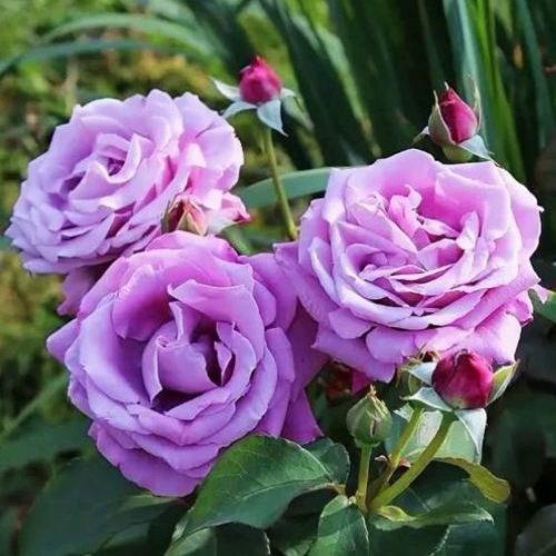 Основной акцент любого растения – это его цветы, и роза Шарль де Голль не исключение. Бутоны этой розы отличаются темно-сиреневым с малиновым оттенком, а распустившиеся цветы приобретают насыщенный сиреневый оттенок с легким голубым акцентом. Такая уникальная окраска делает эту розу необычной и запоминающейся. Бутоны формируются бокаловидными и заостренными.