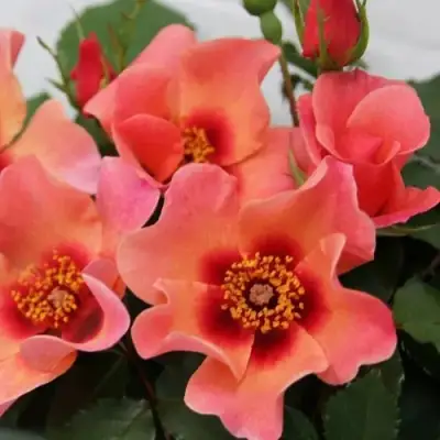 Окраска цветков этой розы впечатляет своим изысканным сочетанием лососёво-розового цвета с абрикосовыми оттенками. У каждого лепестка в основании можно наблюдать тёмное пятно, что делает цветок более выразительным. Основная окраска цветков - розовая. Размер цветка достаточно крупный, его диаметр составляет от 4 до 6 см.